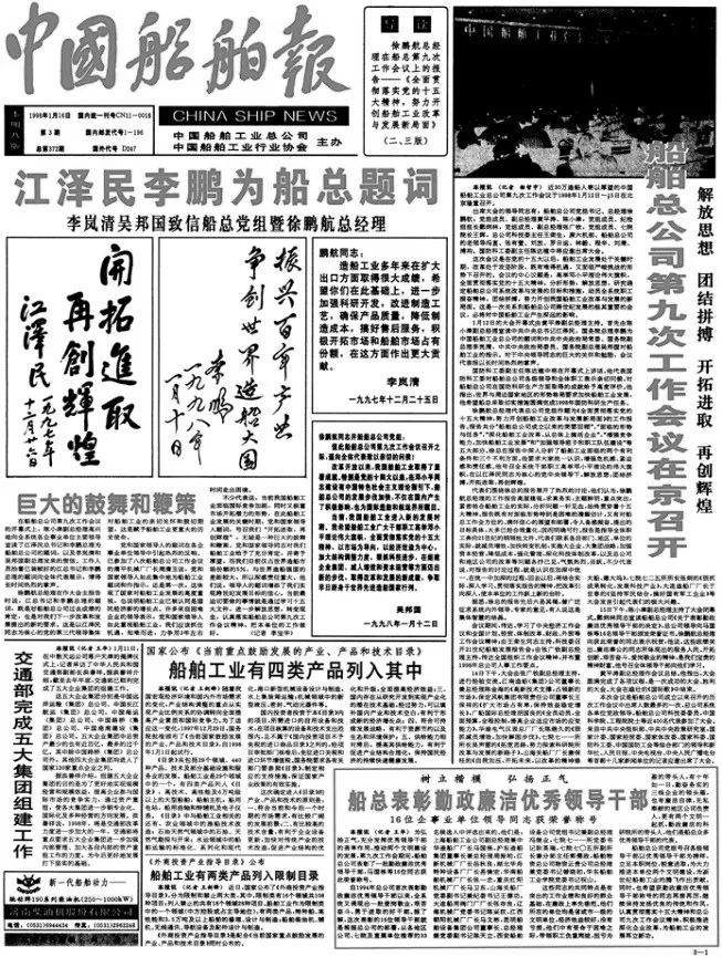 1998年1月16日,《中国船舶报》报道江泽民、李鹏为中国船舶工业总公司题词。