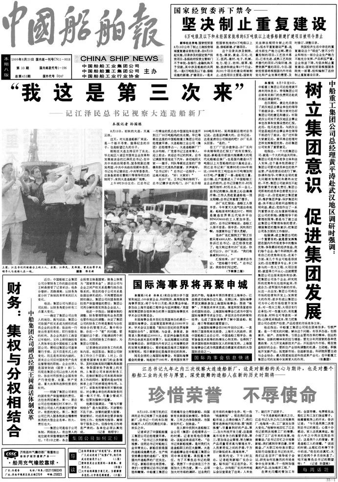 1999年8月20日,《中国船舶报》报道江泽民同志第三次视察大船集团。