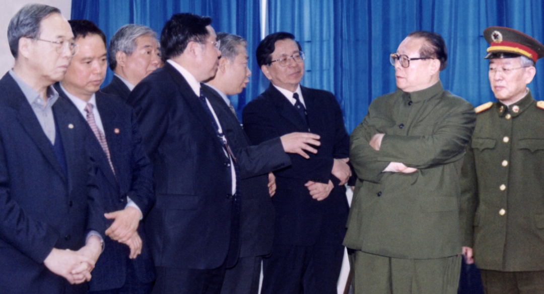 江泽民同志曾参观系统工程研究院、中船电科旗下海鹰公司产品。图为1995年,江泽民同志参观海鹰公司展台。