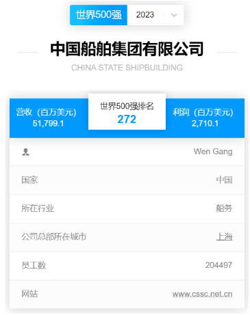 北京时间2023年8月2日,《财富》中英文网站同时发布2023《财富》世界500强排行榜,中国船舶集团有限公司以517.991亿美元的营业收入位列全球榜单第272位,自2021年重组后首次申报以来连续三年上榜,蝉联全球造船企业首位。