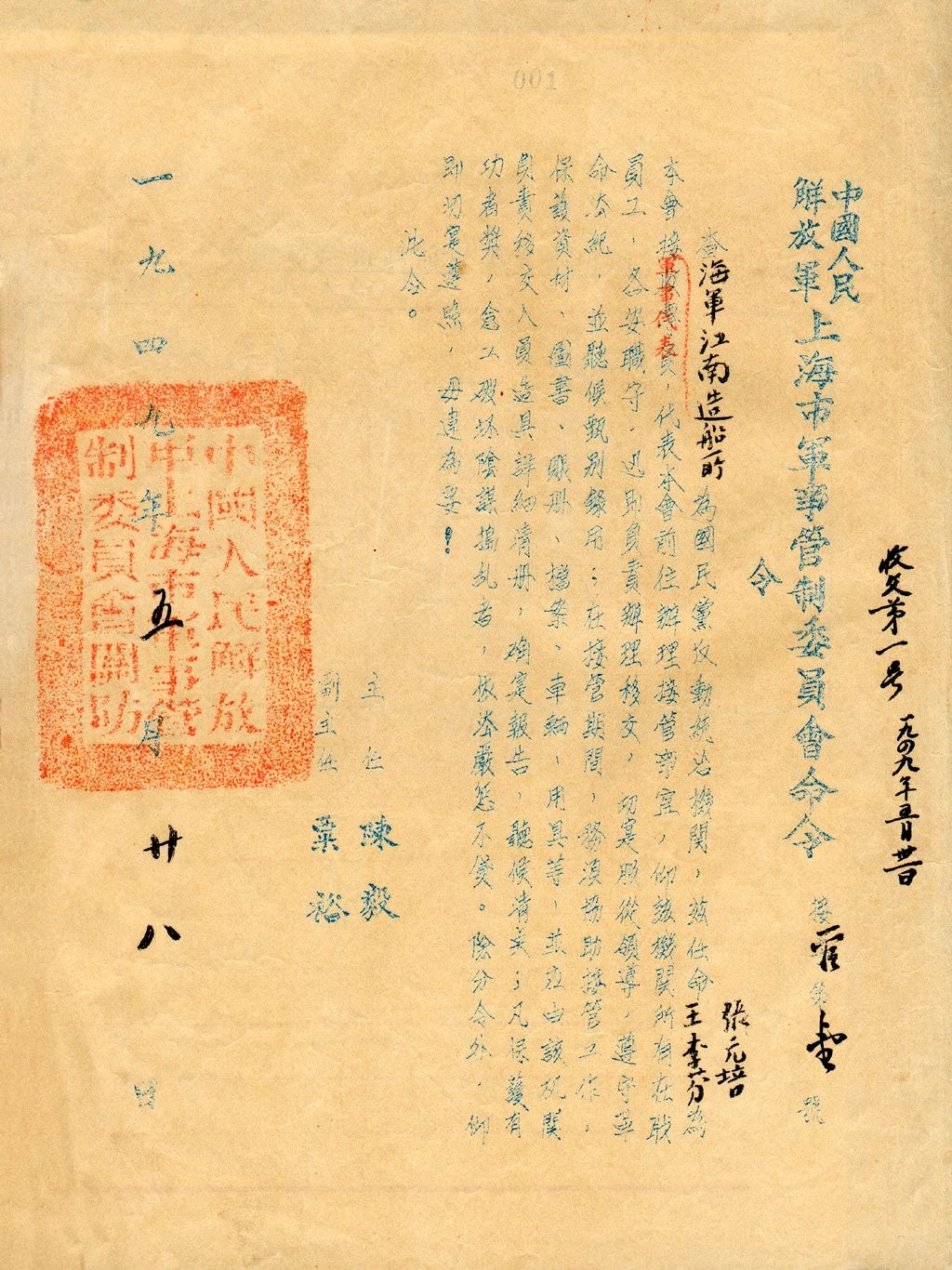 1949年5月上海,1949年5月28日,中国人民解放军上海市军事管制委员会发布第一号“军管令”,即接管海军江南造船所。