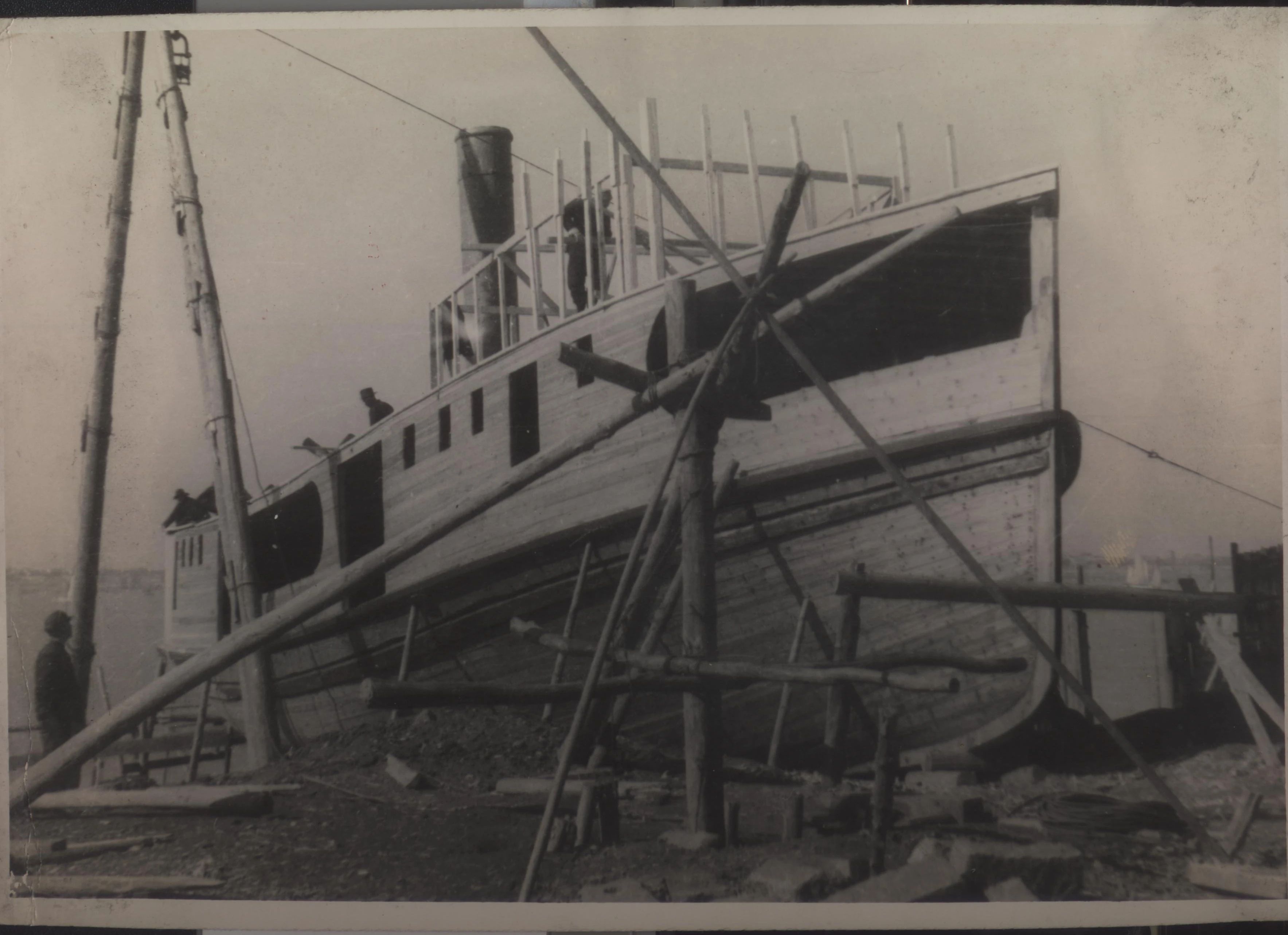 1934年武汉,上世纪30年代,武昌造船成立之初,工人们以手工作业“敲敲打打”形式开展修造船业务。修造的船只大多为100~300吨、钢肋骨与木壳结构,仅有少量是钢铆接船体。建造的船只只能在长江上航行跑跑运输。为了生存和救国,船厂还建造一些农用机械器具、枪支,以辅助民生、支援抗日。