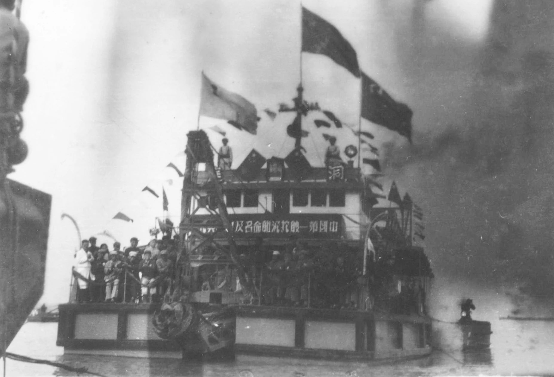 1949年7月上海,1949年7月23日,江南造船所举行“职工庆功大会”。上海市市长兼军管会主任陈毅、副市长曾山、华东海军司令员张爱萍、上海市总工会主席刘长胜等出席了大会。会上总结修复厂房设备的经验,宣布恢复生产表彰有功人员。全所有 134人被评为一、二、三等功臣受到表彰。