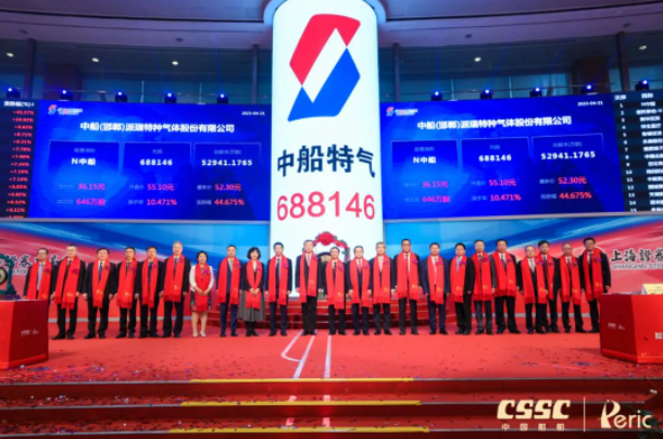 4月21日,中国船舶集团有限公司旗下中船(邯郸)派瑞特种气体股份有限公司(简称:中船特气,证券代码:688146)首次公开发行A股上市仪式在上海证券交易所举行。这是中国船舶集团旗下第12家上市公司,也是集团公司重组后首家在科创板公开发行A股的上市公司。中国船舶集团党组书记、董事长温刚出席仪式,党组成员、总会计师贾海英出席仪式并致辞,党组成员、副总经理盛纪纲出席仪式。