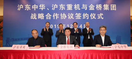 在杨金成、翁祖亮、冯永强、杭迎伟的共同见证下,中国船舶集团旗下沪东中华造船(集团)有限公司、沪东重机有限公司与上海金桥(集团)有限公司签订了战略合作协议。