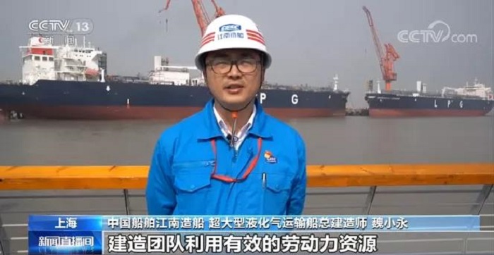 江南造船超大型液化气运输船总建造师魏小永:“为了保订单抢进度,江南造船复工之后5艘大型液化气体运输船(VLGC)同时建造,我们排除万难保节点,建造团队利用有效的劳动力资源,紧盯每日计划,大大压缩了码头周期,系泊试验试航周期,为提前交船打下了坚实基础。”