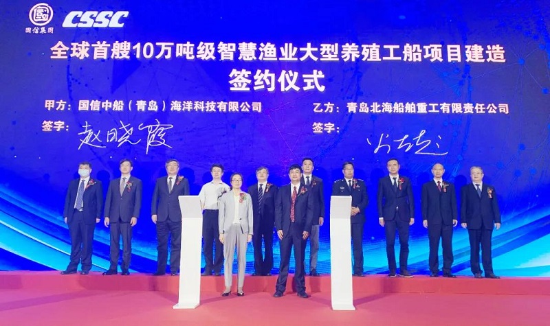 6月3日,中国船舶集团有限公司旗下武船集团青岛北海船舶重工有限责任公司与国信中船(青岛)海洋科技有限公司在青岛西海新区正式签署全球首艘10万吨级智慧渔业大型养殖工船的建造合同。本次签约标志着养殖工船项目正式进入实质性建造阶段,该船将于2022年3月交付。中国船舶集团党组成员、副总经理孙伟,青岛市副市长耿涛等领导和嘉宾出席签约仪式。
