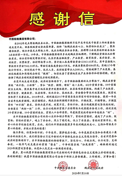 近日,中国船舶集团收到了一封来自云南鹤庆的感谢信。从初识到现在,我们已在脱贫攻坚的战场上,携手奋战19载,如今正一鼓作气攻克最后的贫困“堡垒”。
