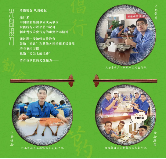 为认真贯彻落实习近平总书记关于制止餐饮浪费行为的重要指示精神,大力弘扬中华民族勤俭节约、珍惜粮食的文明用餐习惯,中国船舶集团积极开展“制止餐饮浪费 践行光盘行动”专项宣传引导活动。