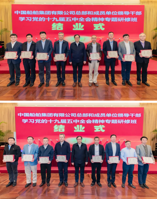 4月23日,中国船舶集团有限公司总部和成员单位领导干部学习党的十九届五中全会精神和党史学习教育专题研修班圆满结业。培训期间,中国船舶集团党组书记、董事长雷凡培以《深入贯彻落实习近平总书记重要指示批示精神 努力加快建设世界一流船舶集团》为题给全体学员们讲授了第一课,中国船舶集团党组副书记、总经理杨金成,党组成员、副总经理孙伟、盛纪纲以及相关部门负责人先后出席各期结业式并听取了学员们的学习汇报。