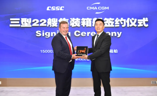 4月30日,中国船舶集团旗下中船贸易携手江南造船、沪东中华、北船重工联合承接法国达飞海运集团3型22艘集装箱船订单,中国船舶集团党组成员、副总经理孙伟,达飞集团执行副总裁泽维尔出席签约仪式。