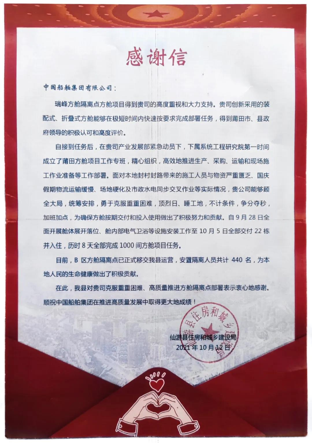 近日,中国船舶集团收到了福建省莆田市仙游县住房和城乡建设局发来的一封感谢信。