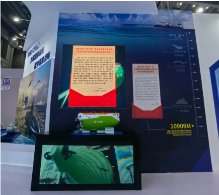 吸引眼球的还有“奋斗者”号载人潜水器,以及雪龙-2号、远望7号等深海极地重大装备、航天测量船家族。在展台处,不仅播放了“奋斗者”号万米深潜坐底激动人心的画面,还展示了习近平总书记的贺信,激励中国船舶人踔厉奋发、勇毅前行。