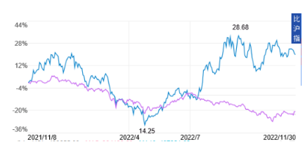 很显然,中船系凭其创新和产业链优势已成为中国资本市场一股新生力量。中国船舶集团龙头股中国船舶(600150)2022年11月30日收盘价比去年同期上涨约20%,跑赢大市。下图为2022年11月30日中国船舶与沪深300指数涨跌对比图,上部曲线为中国船舶,下部曲线为沪深300。