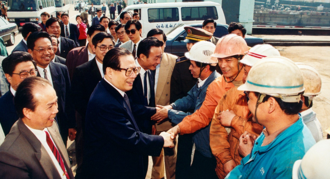 1994年4月29日,江泽民同志在视察江南造船时看望工人。