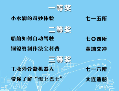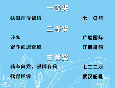 由中国船舶集团党群工作部指导,中国船舶集团新闻宣传中心/中国船舶报社承办的中国船舶集团第二届短视频大赛圆满落幕。经过前期筛选,网络投票,并特邀国务院国资委新闻中心、国防科工局新闻宣传中心、中央电视台、微博政务、中国船舶集团党群工作部专家评审,大赛最终评出一等奖5部,二等奖10部,三等奖23部,同时评出优秀组织奖单位6家。名单如下,快来围观!