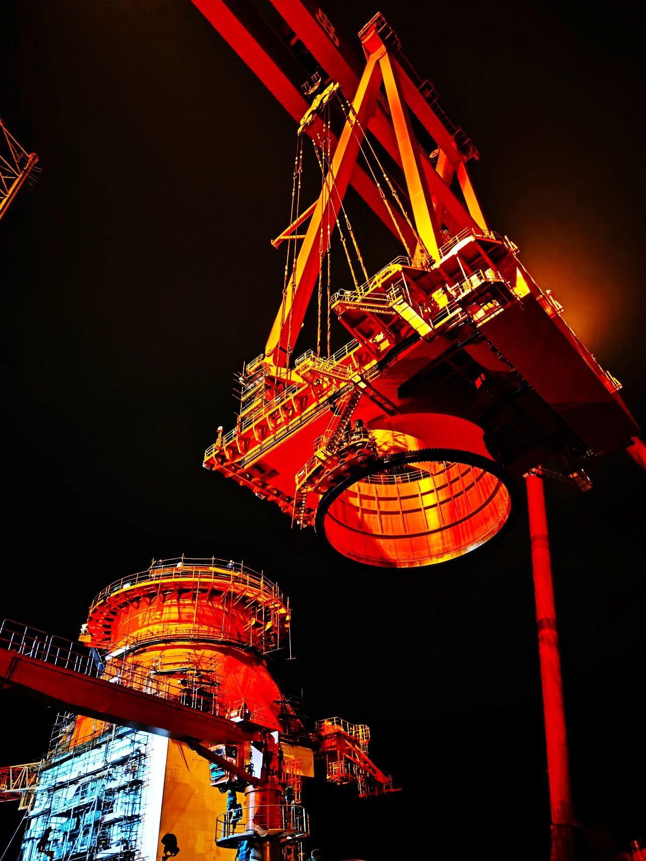 在武汉船机平台总装现场,华夏金租神大平台配套的1200吨起重机正在安装,大件吊装各项准备工作繁琐,一切就绪时,天已经黑了,现场一鼓作气开始吊装对接,展现了船舶人只争朝夕、不负韶华、忘我工作精神风貌。