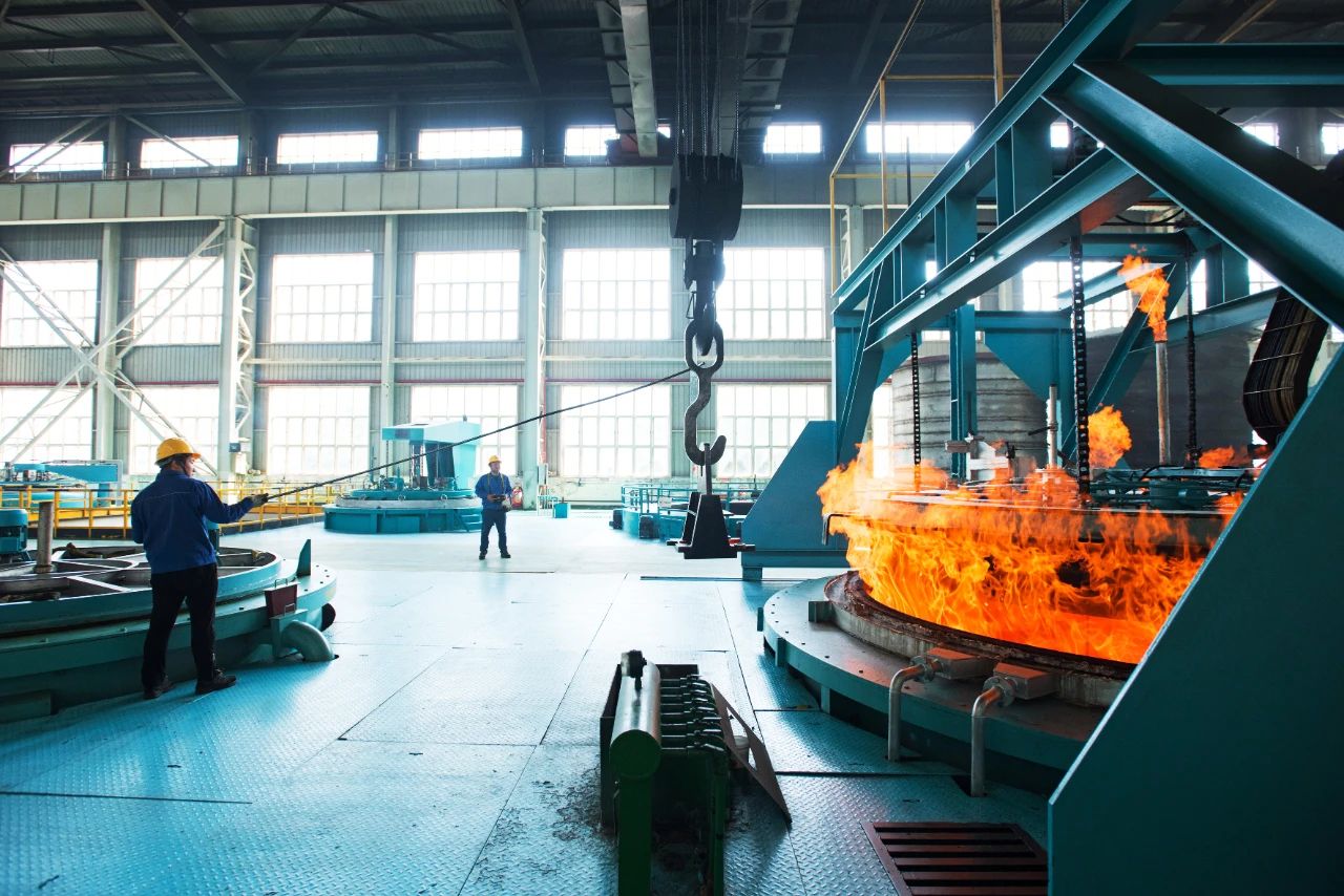 热处理工人们面对着高达800摄氏度的高温火焰,毫无惧色,依然稳定地操作着设备。