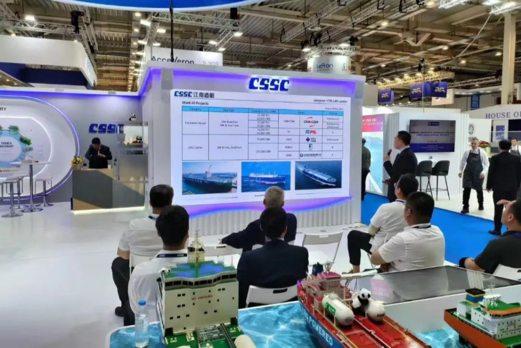 此次展会,中国船舶集团携旗下19家成员单位参展,有关成员单位负责人率队赴展会开展重点船海项目经营洽谈并拜访当地和周边国家客户。集团公司以“共赢未来”为参展主题,设置集团总体区、绿色航运解决方案区、低碳环保配套设备区共3个展示区域,重点展示了135500总吨大型邮轮、175000方LNG运输船、24000箱超大型集装箱船、210000吨氨燃料散货船、LNG双燃料VLCC等一系列高技术、高附加值明星产品,以及CPGC-WinGD 10X92DF-M甲醇双燃料发动机、船用碳捕捉系统等全球船东高度关注的绿色低碳配套设备。同时,通过展台上醒目的品牌标识、层级化的品牌体系图、富有感染力的品牌推介视频,首次面向全球客户,立体化展示“中国船舶”品牌及下属企业品牌和产品品牌体系,进一步强化了集团公司品牌形象。