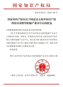 近日,由中船集团所属中船综合院(集团公司知识产权中心)申报的海外知识产权纠纷应对指导船舶产业分中心,获得国家知识产权局批准设立。截至目前,该中心是国家知识产权局在全国设立的第五家产业分中心,也是船海产业领域唯一一家分中心。该中心的设立,为船舶企业“走出去”提供全链条知识产权保障,助力船舶产业在海外市场中更好应对知识产权挑战。