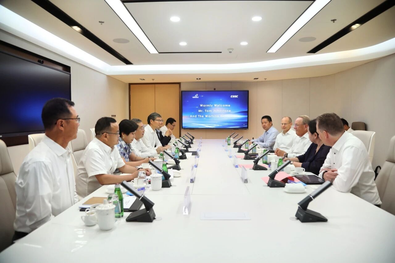 9月2日,中国船舶集团有限公司董事、总经理王国强在上海与来访的瓦锡兰集团董事长Tom Johnstone会谈。双方围绕共同推动全球船海事业脱碳减排、绿色发展等进行深入交流,并就进一步深化合作达成共识。中船集团副总经理胡贤甫,瓦锡兰集团CEO兼总裁Hakan Agnevall参加会谈。