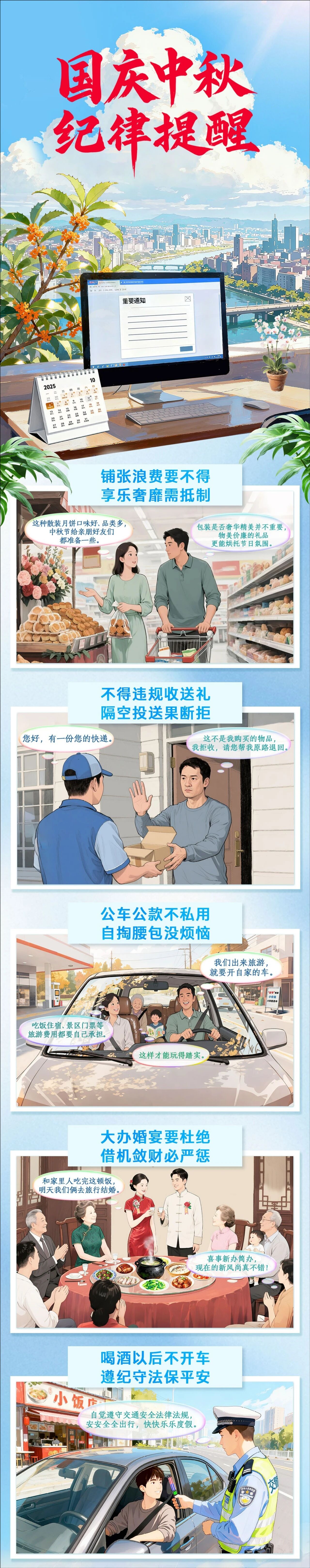 中秋月圆映初心 家国同庆话清风 2025年国庆与中秋双节将至 在这团圆欢庆的时刻 我们要 持续加固中央八项规定精神堤坝 严防 “四风” 问题反弹回潮 全体党员干部员工 绷紧纪律之弦,守住廉洁底线 让节日氛围更纯粹 让清风正气满乾坤