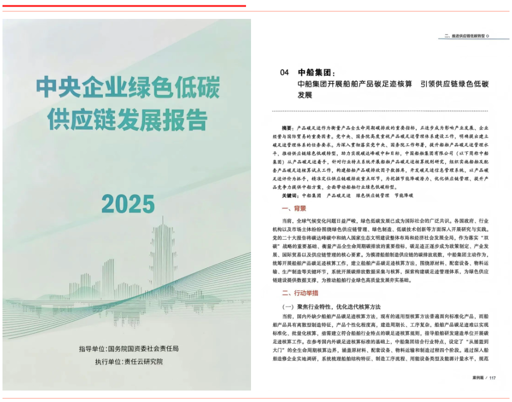 《中船集团开展船舶产品碳足迹核算引领绿色供应链低碳发展》聚焦船舶产品全生命周期碳足迹核算,构建了行业首套核算规则与数据库,有效带动供应链上下游协同减排。该案例入选《中央企业绿色低碳供应链发展报告(2025)》。