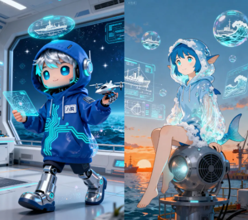 建建(造船担当)以银色防护头盔(嵌船舶零件电子屏、印舰船剪影)、船锚腰带、CSSC工装及焊枪,凸显造船匠心精神;航航(航行担当)凭船舵头饰、导航罗盘、海鸥披风与船锚上衣,传递中船航行使命。二者以 “建造 - 航行” 闭环,具象中船全链条实力,彰显中船文化。