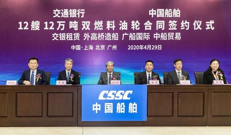 4月29日,中国船舶集团有限公司旗下中国船舶工业贸易有限公司、上海外高桥造船有限公司、广船国际有限公司与交通银行股份有限公司旗下交银金融租赁有限责任公司在北京、上海、广州三地以“云签约”方式签署12艘12万吨双燃料油船建造合同,合同总金额约46亿元人民币,这是中国船舶集团旗下单位近期承接的又一单笔大额订单。中国船舶集团党组书记、董事长雷凡培,交通银行党委书记、董事长任德奇,中国船舶集团党组成员、副总经理孙伟,交通银行党委委员、副行长吕家进出席签约仪式。