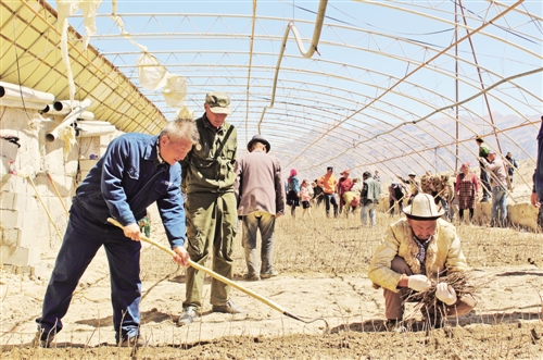 马学涛(左一)与村民们一起在大棚种沙棘。(王 箐摄)