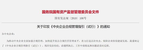 国资委印发《中央企业合规管理指引(试行)》