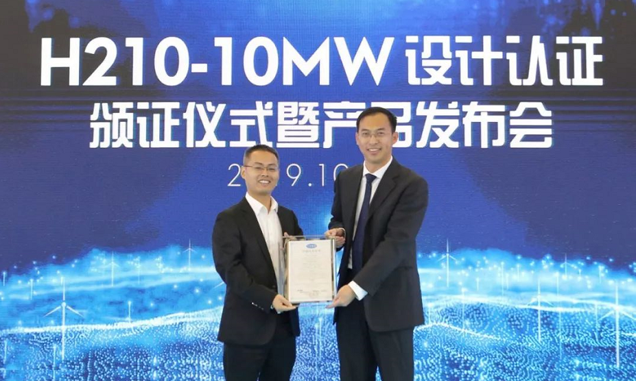 中国电力科学研究院为中国海装颁发了H210-10兆瓦设计认证证书。H210-10兆瓦海上风电机组的推出,填补了我国超大型海上风力发电机组的空白。中国海装10兆瓦海上风电机组是中国海装自主设计、正向研发、具有自主知识产权的又一核心前沿产品。其高效高可靠中速中压集成式传动发电系统,大大提升了机组的可利用率、可制造性、可维护性;先进的电动双驱变桨技术,提高了变桨系统驱动能力和安全水平;搭配国内首款100米级超长柔性碳纤维叶片,10兆瓦海上风电机组可实现我国海上各类风区全覆盖应用;在年平均风速为10米/秒(标准空气密度)的相同风资源条件下,中国海装10兆瓦机组发电量较H151-5兆瓦机组发电量可提升98%。