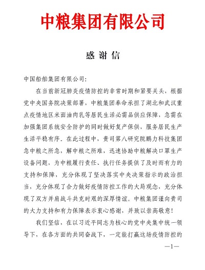 在这场战“疫”中,中国船舶集团没有缺席——所属八院鹏力科技集团紧急承担平面口罩机、N95口罩机、压条机等医疗物资生产关键设备研制攻关任务,以“战时速度”硬核抗疫。近日,中国石油、中粮集团、中国诚通集团等,纷纷发来感谢信,对鹏力科技集团的全力支持表达深深的谢意。