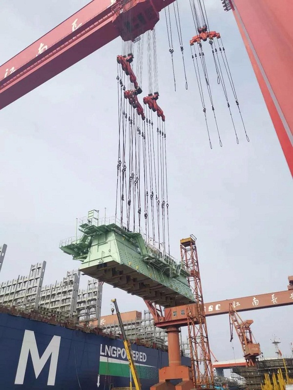 全球最大双燃料集装箱船主机吊装完成!中国船舶所属江南造船又创纪录!