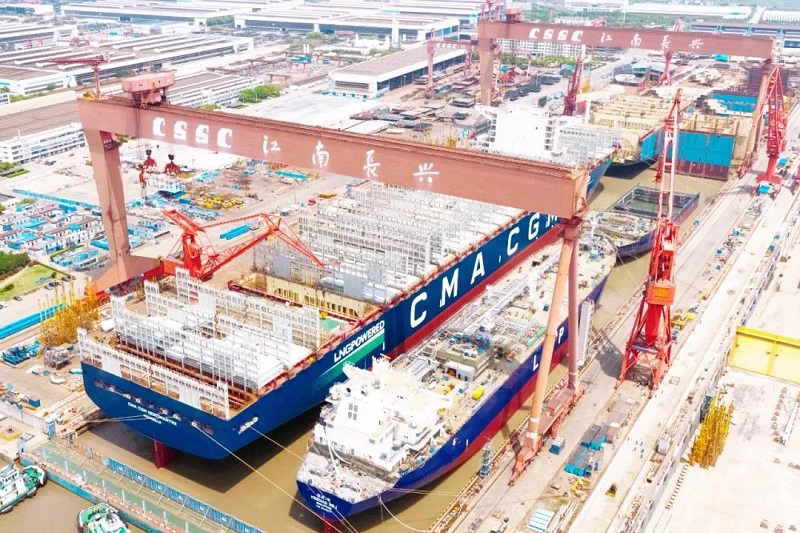 众所周知,船坞是船舶总组搭载的场所,是造船生产的核心资源。江南造船3号船坞长580米、宽120米,是目前国内在用的最大船坞。为提升船坞利用效率,江南造船采取“双线并造”模式,即一批次液化气船和一批次超大型集装箱船同时建造。此次双船出坞是江南造船“双线并造”模式的第五个批次,也是今年3号坞出坞的第二个批次。