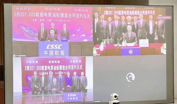 5月18日,中国船舶集团旗下大船集团、中船贸易与招商局集团旗下招商轮船在北京、大连、香港三地以“云签约”方式签署2艘30.7万载重吨原油船建造合同。中国船舶集团副总经理孙伟、招商局集团副总经理王宏、招商轮船董事长谢春林出席签约仪式,中船贸易董事长李洪涛、大船集团总经理杨志忠、招商轮船总经理王永新代表各方在建造合同上签字。