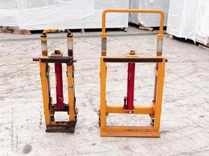 △ 左图为运输液压小车,右图为工人正在操作小车运输。