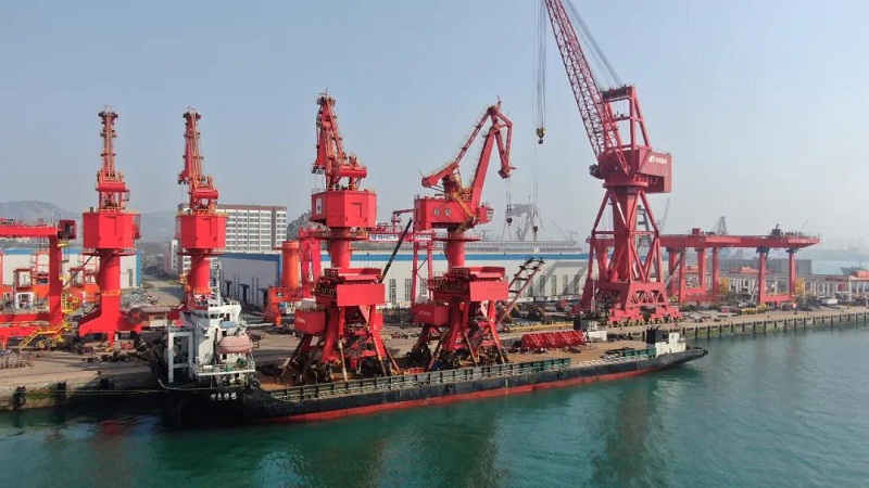 此次交付日照港山钢码头有限公司的3台门机均为四连杆门机,最大起重量45吨,性能完备、稳定可靠、装卸高效。
