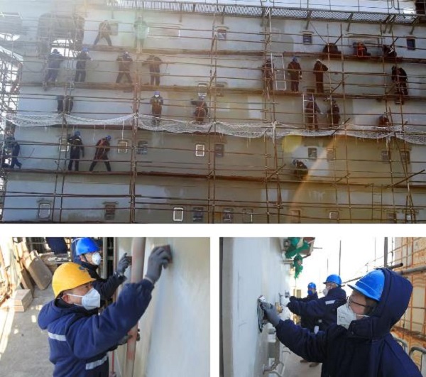 为确保该船按期实现试航节点,大船集团山船重工先后组织150余名党员干部投入到该船生活区外板拉毛工程中。党员们根据所分配的区域,站在十几米高的脚手架上,手里拿着磨砂纸,一点一点地磨,一块一块地蹭,不放过每个细节。