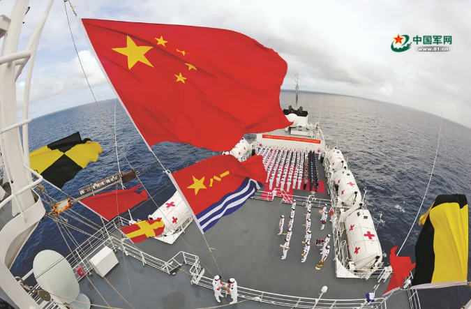 “和平方舟”号医院船在大洋上举行隆重升旗仪式。来源:中国军网 江 山摄