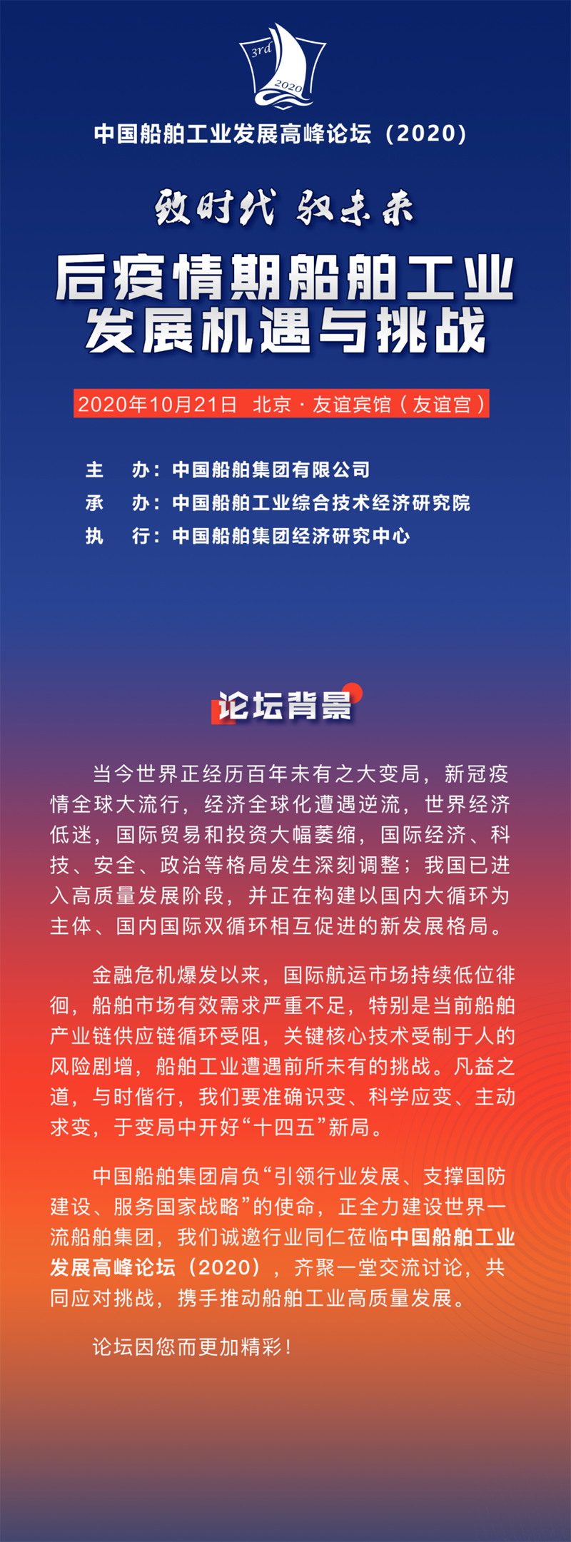中国船舶集团肩负“引领行业发展、支撑国防建设、服务国家战略”的使命,正全力建设世界一流船舶集团,我们诚邀行业同仁莅临中国船舶工业发展高峰论坛(2020),齐聚一堂交流讨论,共同应对挑战,携手推动船舶工业高质量发展。