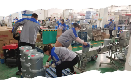 ▲热火朝天忙生产,第三研究室汽车防冻液生产车间各条生产线安全有序生产,呈现一片繁忙景象。图为工作人员按照操作规程有序生产汽车防冻液产品。