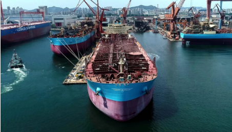 1月4日,中国船舶集团旗下大船集团为马士基油轮建造的11.5万吨原油/成品油船44号船签字交付。该船总长250米,型宽44米,型深21.9米,载重吨为11.5万吨,结构吃水15.35米,设计航速14.5节,挂新加坡旗,入英国劳氏船级社。为了满足节能设计要求,该船螺旋桨前方的船体艉轴管上安装节能型导轮,螺旋桨轻转裕度不低于3%。