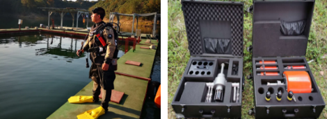 中国船舶集团七一五所超声公司研制的蛙人水下定位监测系统是一型便携、快速布放的水声定位产品,突破了湖泊、海洋、溶洞等不同水域定位误差机理分析、浅水环境下声传播多途效应的信号提取及处理算法等关键技术,能够实时显示水下蛙人位置(距离、方位和深度)和运动轨迹,紧急情况下蛙人可通过SOS键进行实时报警,为陆上指挥中心提供决策依据,实现水下救援数字化管控。该监测系统可广泛用于日常训练、水域救援和物品打捞、船舶事故处置和矿山透水救援等具体场景。