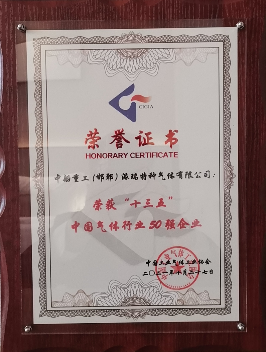 中国船舶集团旗下七一八所所属派瑞特气公司,近日荣获中国工业气体工业协会评选的“十三五”中国气体行业分行业电子气体10强、“十三五”中国气体行业50强企业荣誉称号,以及2021年气体行业专利奖金奖。