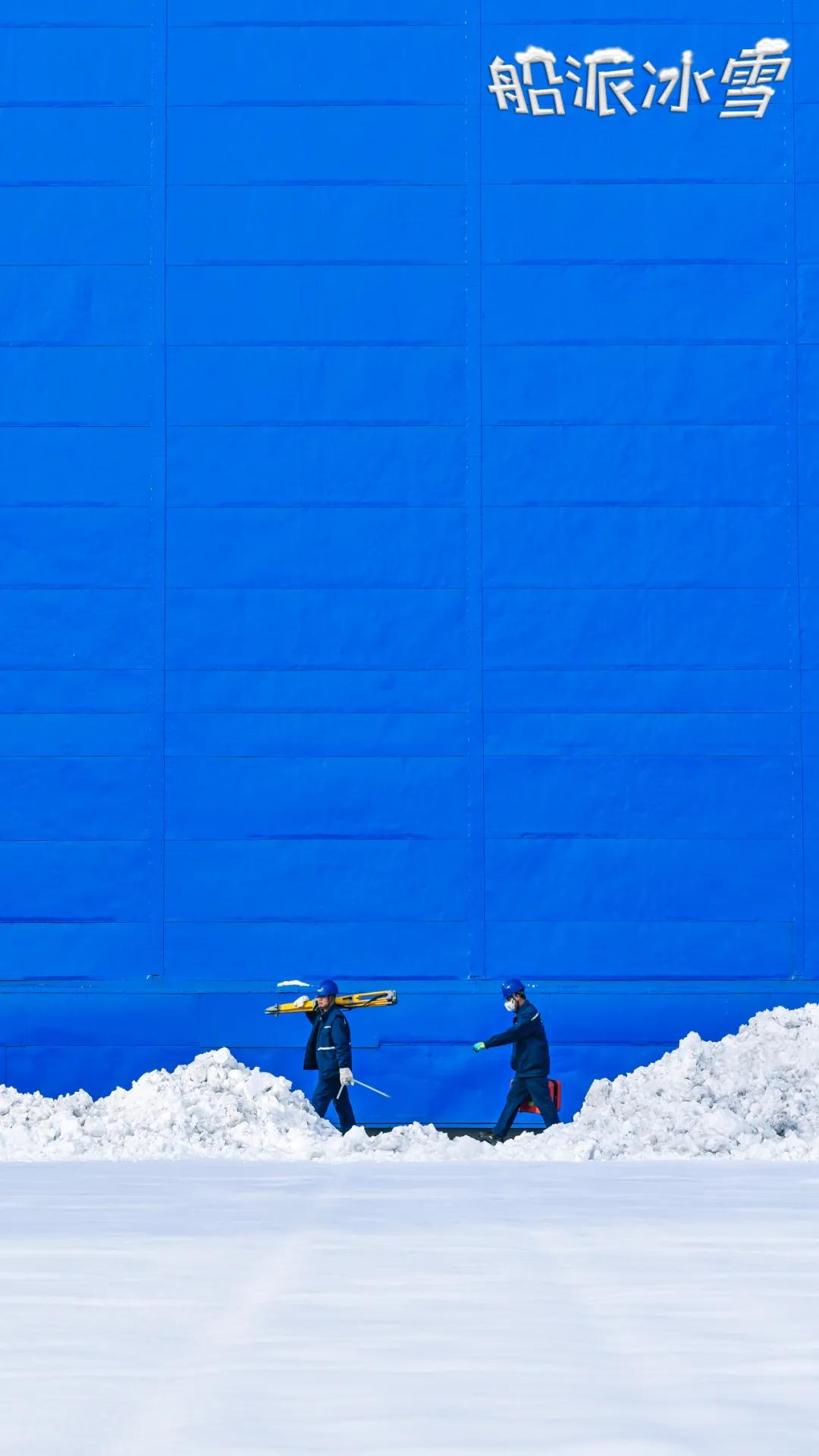 过膝的大雪掩埋了吊车的轨道,渤船小伙抄起“家伙”,为吊车开道,胳膊抡圆,雪花纷飞,别说这画面还真有点浪漫了。