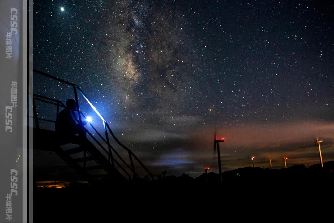 星幕下,中国船舶人在重庆中国海装南天门风电场的漫天星空下,仰望星空,看着风机上的航空灯和璀璨的星河遥相呼应,这一切简直美得妙不可言!