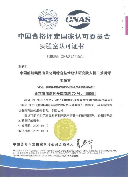 近日,中国船舶集团旗下中船综合院人机工效测评实验室(以下简称“实验室”)获得中国合格评定国家认可委员会(CNAS)实验室认可证书,成为国内首家具备国家认可人机工效测评能力的试验机构。