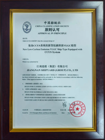 3月21日,中国船舶集团旗下江南造船联合七一一所研发的全球首个配置碳捕捉和存储系统(CCUS)的超大型液化石油气运输船(VLGC)船型方案获得中国船级社原则性认可(AIP)。
