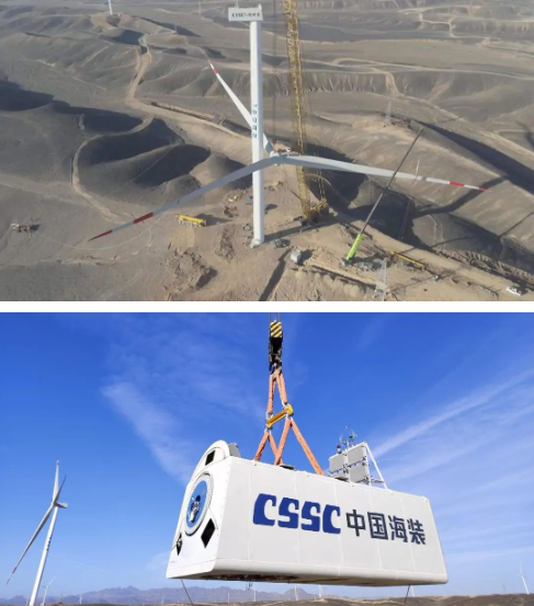 该一体化项目位于全国有名的“百里风区”——新疆哈密市伊州区十三间房区域,项目占地面积约231平方公里,是目前哈密市单体装机规模最大的风储一体化项目。共安装150台中船海装H176-6.7兆瓦风电机组和中船风帆生产的30万千瓦/120万千瓦时的电化学储能装置。